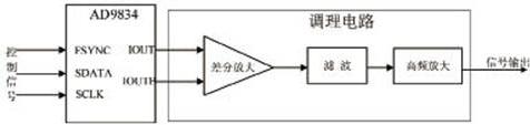 DDS电路设计主要包括接口电路、DDS芯片及信号调理电路等,接口电路主要对DSP发送来的信号进行接收,接收DSP的控制命令,DDS根据收到的DSP控制命令及接收到的频率控制字,生成符合频率要求的信号并输出。由于DDS的输出为电流信号,因此,必须将电流信号通过负载转换为电压信号,将得到的电压信号进行调理即可得到所需的正弦信号。DDS电路设计的原理框图如图3所示。