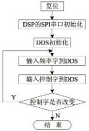 软件流程图如图7所示,主要包括复位、初始化、写频率字和控制字等部分。初始化部分主要包括对 DSP的SPI串行口初始化及配置和对DDS的初始化。本设计把ADSP21992作为主机,通过设置SPICTL寄存器使DSP成为主机,选择 SPICTL寄存器里的TIMOD值为01,从而启动SPI传送数据。当启动数据发送时,DSP自动将TDBR寄存器的内容装入到发送移位寄存器;当数据传送结束时,自动将接受一位寄存器的内容装入到RDBR寄存器。在该系统设计中,AD9834采用串行控制比特位方式选择相位、频率寄存器;PIN/SW =0,选择控制字模式; FSEL=0,选择使用频率寄存器0;D13=0时,将28位的频率寄存器分成2个14位的寄存器工作,且频率字的高14 位和低14 位可以独立改变。SDATA、SCLK 和FSYNC 3个引脚向AD9834 中写数据和控制字。当FSYNC=0时,表示向AD9834 写入1个新字,并将在下1个SCLK的下降沿读入第1位,其余的位在随后SCLK 的下降沿读入,经过16个SCLK下降沿后,置FSYNC=1,实现了DSP对AD9834 的控制。