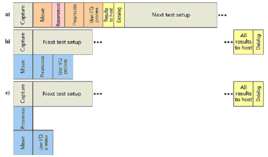 图 4. 这里显示的三种测试选择的测试时间开销:(a) 串行执行流,(b) 批量捕捉与后处理方案,(c) 实时处理。
