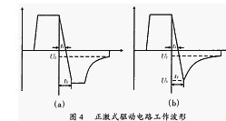 电路原理图如图3(a)所示,N3为去磁绕组,S2为所驱动的功率管。R2为防止功率管栅极、源极端电压振荡的一个阻尼电阻。因变压器漏感较小,且从速度方面考虑,一般R2较小,故在分析中忽略不计。其工作波形分为两种情况,一种为去磁绕组导通的情况,见图4(a);一种为去磁绕组不导通的情况,见图4(b)。
