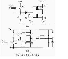 功率MOSFET属于电压型控制器件,只要栅极和源极之间施加的电压超过其阈值电压就会导通。由于MOSFET存在结电容,关断时其漏源两端电压的突然上升将会通过结电容在栅源两端产生干扰电压。常用的互补驱动电路的关断回路阻抗小,关断速度较快,但它不能提供负压,故其抗干扰性较差。为了提高电路的抗干扰性,可在此种驱动电路的基础上增加一级由V1、V2、R组成的电路,产生一个负压,电路原理图如图2(a)所示。