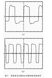 如图6(a)所示,V1、V2为互补工作,电容C起隔离直流的作用,T1为高频、高磁率的磁环或磁罐。导通时隔离变压器上的电压为(1-D)Ui、关断时为DUi,若主功率管S可靠导通电压为12V,则隔离变压器原副边匝比N1/N2为12/(1-D)/Ui。为保证导通期间GS电压稳定C值可稍取大些。实验波形见图7(a)。该电路具有以下优点: