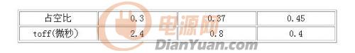 该电路具有以下优点:①电路结构简单可靠,实现了隔离驱动。②只需单电源即可提供导通时正、关断时负压。③占空比固定时,通过合理的参数设计,此驱动电路也具有较快的开关速度。该电路存在的缺点:一是由于隔离变压器副边需要一个假负载防震荡,故该电路损耗较大;二是当占空比变化时关断速度变化加大。脉宽较窄时,由于是贮存的能量减少导致MOSFET栅极的关断速度变慢。表1为不同占空比时关断时间toff(驱动电压从10伏下降到0伏的时间)内变化情况。