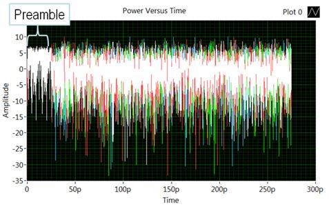 請注意,完整脈波叢 (Burst) 的傳輸功率,將因前置符碼 (Preamble) 到資料符碼 (Data symbol) 而有所不同。根據 802.16-2004 規格來說,前置符碼相對於資料符碼,應達到 3 dB 的升壓 (Boosting)。圖 1 即顯示前置符碼與資料符碼的相對功率。