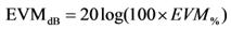 一般來說,使用者可將 EVM 指定為百分比 (%) 或分貝 (dB) 為單位。然而,IEEE 802.11a/g 量測作業的 EVM 是以分貝為單位;IEEE 802.11b 的 EVM 是以百分比為單位。等式 1 則說明轉換此 2 種單位的方法。