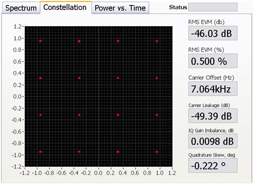 在許多範例中,幾乎可透過星座圖 (Constellation plot) 檢視所有的 EVM 效能。星座圖可顯示各個符碼的相位與強度,讓使用者找出特定的相位差減損 (Quadrature impairment)。圖 10 即為 64-QAM 的星座圖。