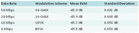表 2. 平均 EVM 將與調變架構產生相對性的一致。