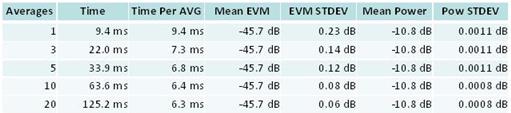 在表 3 中,我們使用 PXIe-5663 RF 向量訊號分析器與 1 組 NI PXIe-8106 控制器,以執行複合的 EVM 與閘控功率量測作業。EVM 是以完整叢集的 RMS 計算所得;且其中的平均值與標準誤差,是以超過 1000 次的量測作業所算出。表 3 則說明,量測時間與平均次數之間趨於線性的關係。NI WLAN 分析 (Analysis) 工具組使用了所謂非同步提取 (Asynchronous fetching) 技術,即當分析器提取新的記錄時,亦同時處理先前的記錄。因此,使用者不需受限於線性時間 (Linear time),亦可針對多筆平均設定量測作業。亦請注意表 3 若設定 1 次平均,則 EVM 與功率量測將耗費 9.4 ms。然而,若設定 10 次平均,量測作業亦僅耗費 63.6 ms;亦即每次平均可省下 6.3 ms。