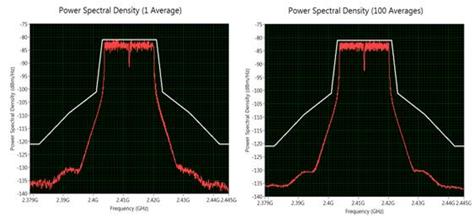 請注意,此與 EVM 量測相似的是:使用者必須考慮量測時間與平均次數之間的關係。由於平均作業可針對雜訊水平 (Noise floor) 提供合理的解釋,因此工程師往往會執行多次平均。在圖 6 中,則可觀察單次平均與 100 次平均的頻譜遮罩量測 (66 MHz 間隔) 作業。