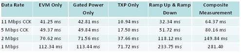 同樣的,表 5 說明平行量測作業可達較高效益。若分別執行 11 Mbps CCK 叢集、EVM、TXP,與緩升/緩降量測作業,將需要 126 ms 量測總時間;但若平行量測僅需 64 ms 量測總時間。