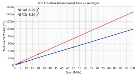 對數位 IF 分析器與傳統的掃頻 (Swept-tune) 分析器而言,若量測間隔較寬,其所需的量測時間亦較長。若使用傳統的掃頻分析器,則量測時間與間隔將呈現線性關係。如此一來,若將 100 kHz RBW 濾波器以所需間隔進行掃頻,而量測時間將與量測間隔構成線性關係。但若透過向量訊號分析器 (如 NI PXI-5661 與 NI PXIe-5663),則其結果將有些許不同。與向量訊號分析器的瞬間頻寬 (Instantaneous bandwidth) 相較,頻譜量測作業的即時頻寬較為狹窄,因此不需重新微調 (Re-tune) 儀器的 RF 前端,亦可完成量測作業。