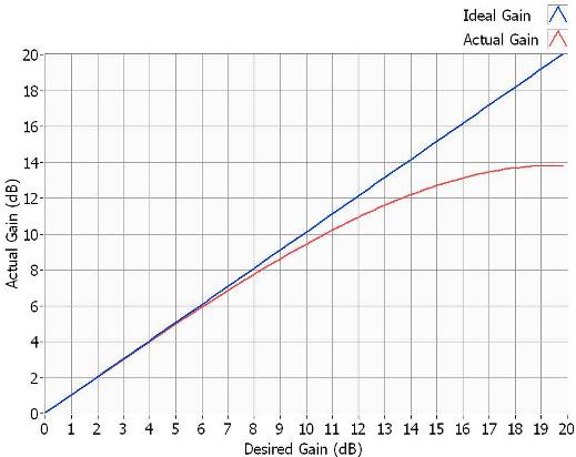 如同上圖所示,該現象屬於週期性增益失衡,即定期於星座圖的水平軸與垂直軸上延伸。在圖 11 中,該增益設定以 6 dB 的幅度定期變化。若針對 RF 建置直接升轉換作業,則增益失衡極有可能產生影響。此現象起因於基頻子系統 I 與 Q 輸出之間的振幅落差 (Amplitude disparity),並可能由於接收器的 EVM 而提升其強度。