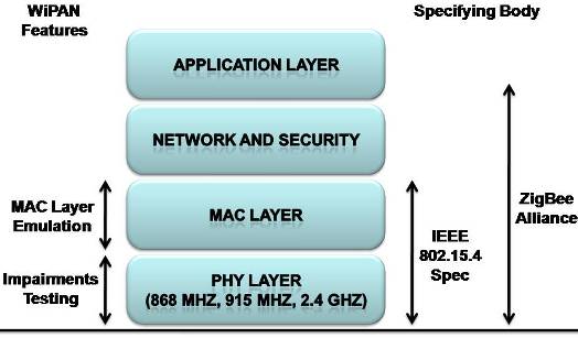 如上圖所示,IEEE 802.15.4 標準定義了 ZigBee 傳輸的 MAC Layer 與 PHY Layer。常見的測試程序,則是以封包產生作業進行 MAC Layer 模擬;故意造成訊號減損以測試 PHY Layer。