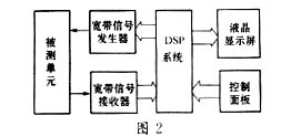 (3)以DSP芯片为核心,对外围宽带信号发生器、宽带信号接收器、液晶显示屏、控制面板等部分进行智能系统设计,其基本工作原理是:由信号发生单元产生一个从20Hz~2MHz的宽带信号输送到被测电路,其输出接到信号接收单元,再由DSP芯片进行频谱分析,扫频结果由液晶显示直观地显示出来,键盘采用轻触开关控制扫频范围、输出/输入信号衰减dB值等设置,其系统框图如图2所示。