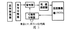 硬件频率合成器产生和校准。由于MC145151是14位数据线,而AT89C51是8位数据线,在软件设计中采用右对齐的方式分两次送数,即先送低8位,然后送高8位,在硬件设计中采用两级数据锁存器。程序框图略。