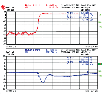 对于发射机和频综源来说,它们的幅度、频率和相位瞬态特性是重要的测试指标。一般来说,频率稳定时间是指发射机在输出电平达到一定数值(通常为稳定输出功率-30dB)开始,监测FM解调频谱,直到频率稳定到设计限值之内的这一段时间。