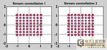 图2 Tx1和Tx2的64 QAM数据流信号的群视图,这是一种理想情况,其中调制信号是没有失真的