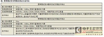 根据测试状态和被测件性能要求,PNA脉冲网络仪可以采用两种不同的方法来完成对脉冲器件的测试。这两种方法分别是宽带模式和窄带模式(见表1所示)。宽带模式是指网络分析仪接收机带宽大于脉冲调制信号的带宽,能够对测试的脉冲调制信号充分响应,接收机在触发控制条件下完成测试。宽带测试模式主要适合于较宽脉冲宽度的测试要求,测试的动态范围与脉冲调制信号的占空比无关。窄带模式是指接收机带宽小于脉冲调制信号的脉冲重复频率,通过接收机的滤波,脉冲调制信号被转换为连续波信号,测试时不需要触发的控制。窄带模式适合于窄脉冲宽度状态的测试,测试动态范围不受脉冲宽带的限制。Agilent PNA网络仪采用专有的数字滤波处理技术,能完成针对不同脉冲重复频率信号的滤波处理。Agilent PNA网络仪的高灵敏度接收机也确保了窄带测试模式下系统的动态范围和测试精度。