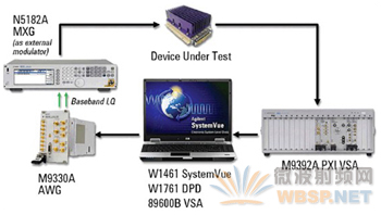 另一个测量挑战出现在测量数字预失真(DPD),为了改善失真,需要产生和测量占用带宽高出3-5倍带宽范围内的功率放大器的线性特征。安捷伦SystemVue W1716 DPD Builder软件能够提供一个自动数字线性失真设计测试应用。该软件产生一个激励波形,下载到信号源,信号源产生的信号通过功率放大器后使用信号分析仪接受放大后的信号,并将信号解调出来,传输给测试电脑,软件通过对比激励波形和接收到的波形判断失真情况,从而达到测量和分析功能。如下图: