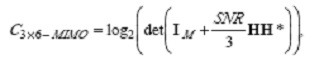 当测量暗室中的MIMO 阵列时,通过暗室壁上的3个单极子天线(在这个例子中)。我们可以定义3 x 6=18个通道。我们可以通过归一化的S21参数得出的通道矩阵H3X6-MIMO 推算出混合通道容量。此时的瞬间MIMO系统的容量推导公式为