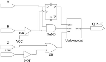 该测试模块需要从天线平台测试仿真转台接受平台的位置信息,在各类运动控制系统中,常采用增量式光电编码器作为反馈检测元件,其输出为相差90度的A、B两相信号以及周期脉冲复位信号Z,A、B两相信号相差的正负决定运动的正反方向,A、B两相信号的脉冲输出计数决定位置运动的大小,Z为过零复位脉冲。整个解码逻辑设计如图2所示。