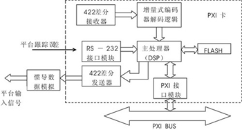 增量式编码器解码模块与422差分接收器配合,用于天线仿真转台两轴位置数据的解码;DSP主处理器完成测试数据的处理,PXI接口模块主要完成PCI总线信号到本地总线的转换接口;RS-232接口模块接受PSD(光敏位置探测器)的串行输出信号,PSD在测试系统中用于探测天线平台的跟踪仿真转台运动的误差。