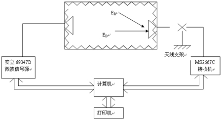 微波暗箱反射率电平的测试系统主要由发射信号源(69347B)、接收机(MS2667C频谱分析仪)、计算机及接收天线和测试支架组成,见框图(7)。其中信号源为发射天线输出一个微波直射信号,由频谱分析仪接收来自各方向的反射及直射信号,并由计算机读出后描绘出一个空间驻波曲线,并计算出反射率电平。天线支架用来控制测试天线的上下、左右直线移动及转角姿态的变化动作。为了能比较准确地描绘出空间行程驻波曲线,天线移动的行程距离必须大于等于两个波长。最后通过改变接收天线取向角以获得若干条驻波曲线,从而达到测试小圆柱型微波暗箱反射率电平的目的。