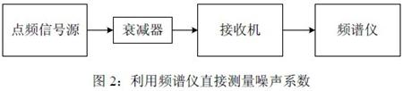 利用频谱仪直接测量噪声系数的仪器连接如图2 所示,其中点频信号源用于整个通道增益的校准,衰减器有两个作用,一是起到改善前端匹配的作用;二是做通道增益校准使用,因接收机增益往往很高,大于100dB,而一些信号源不能输出非常弱的信号,配合该衰减器即能完成该功能。