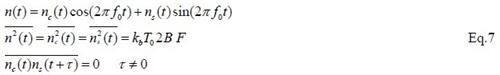 现在考虑噪声问题,为简化计算,这儿设当前温度为290K,即定义噪声系数的标准温度。根据噪声系数的定义,我们可以将系统产生的噪声等效到输入端口,该噪声与资用噪声功率和应等于资用噪声功率的F 倍。下面我们用一个窄带平稳高斯过程来描述这两部分噪声之和,设噪声带宽为2B,下面方程给出了该噪声的一些特性:
