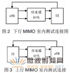 MIMO的测试分为下行与上行,上行主要是单发多收(SIMO)。图2与图3分别给出MIMO下行与上行的测试图。下行的MIMO增益主要体现在不同的信道条件下不同MIMO方案的系统吞吐量。对于MIMO技术的测试,需要信道模拟仪制造不同的信道衰落条件。这些条件包括: