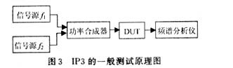 IP3的一般测试方法是按照图3搭建测试环境,向DUT输入2个强的单音信号,测出DUT输出端单音信号的电平和三阶互调产物的电平,再利用式(1)和式(2)计算出IP3的大小。