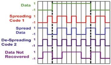 通过DSSS,用户基线数据由众多扩频码的其中之一调制。此类代码也称为“信道化码”,每一个代码是一个高速率(3.84兆位/秒)、循环重复的伪随机二进制序列,可“碎化”基线数据,达到3.84MHz的带宽。