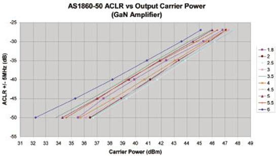 图10 WCDMA ACLR与GaN放大器载波功率特性